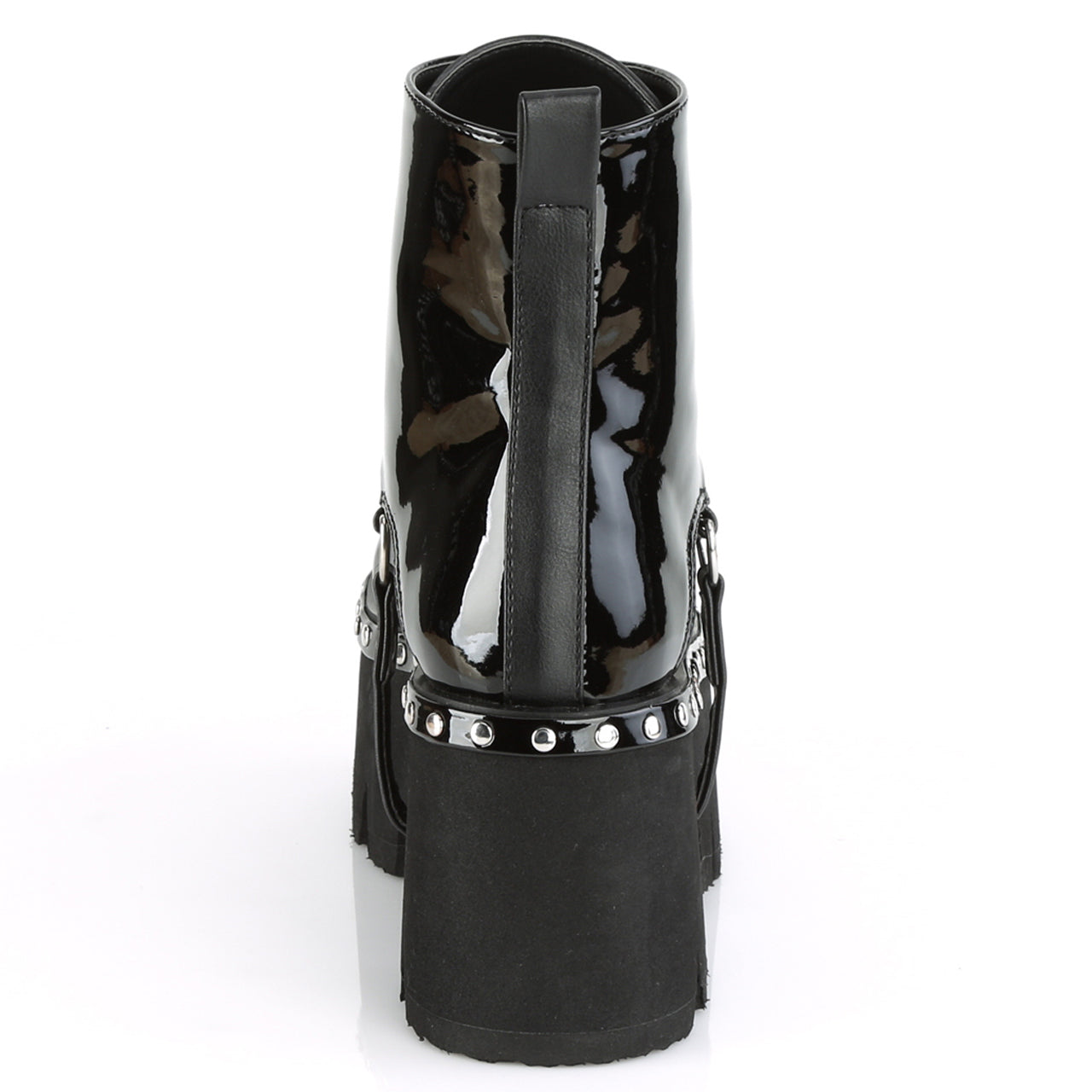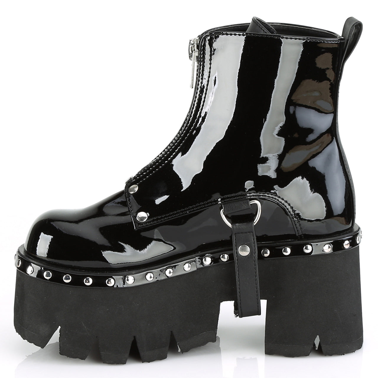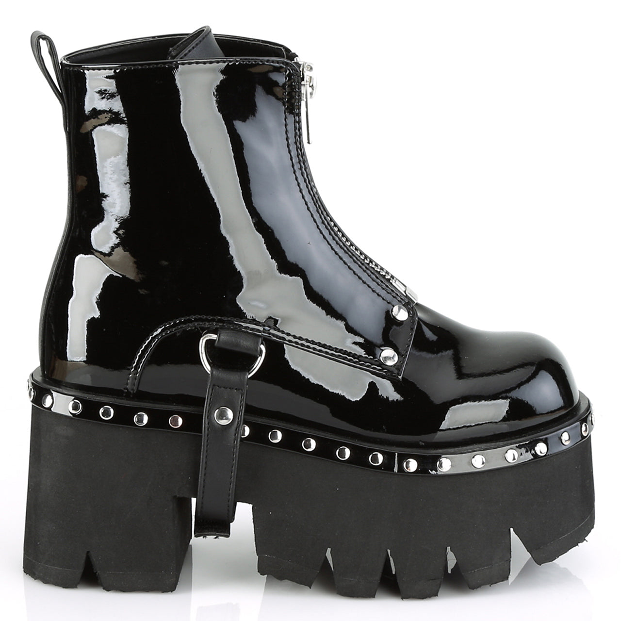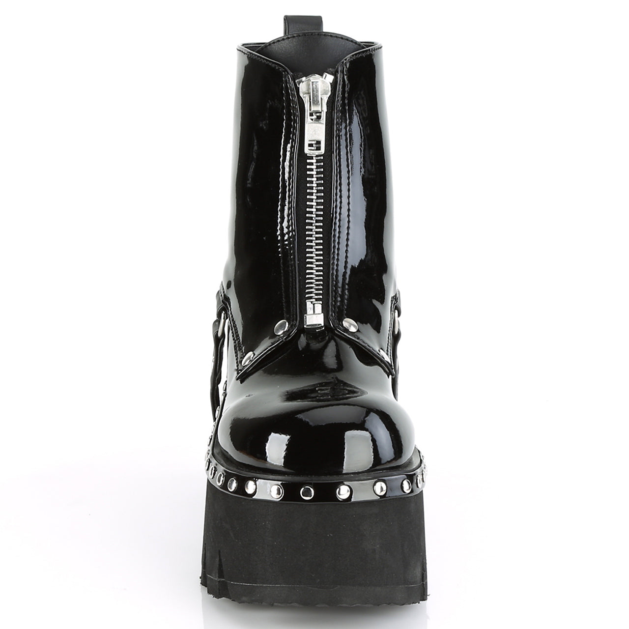 Cut-out platform ankle boots Metal front zip closure Upper and trim accented with harness running down from silver stud bottom Made of vegan patent leather