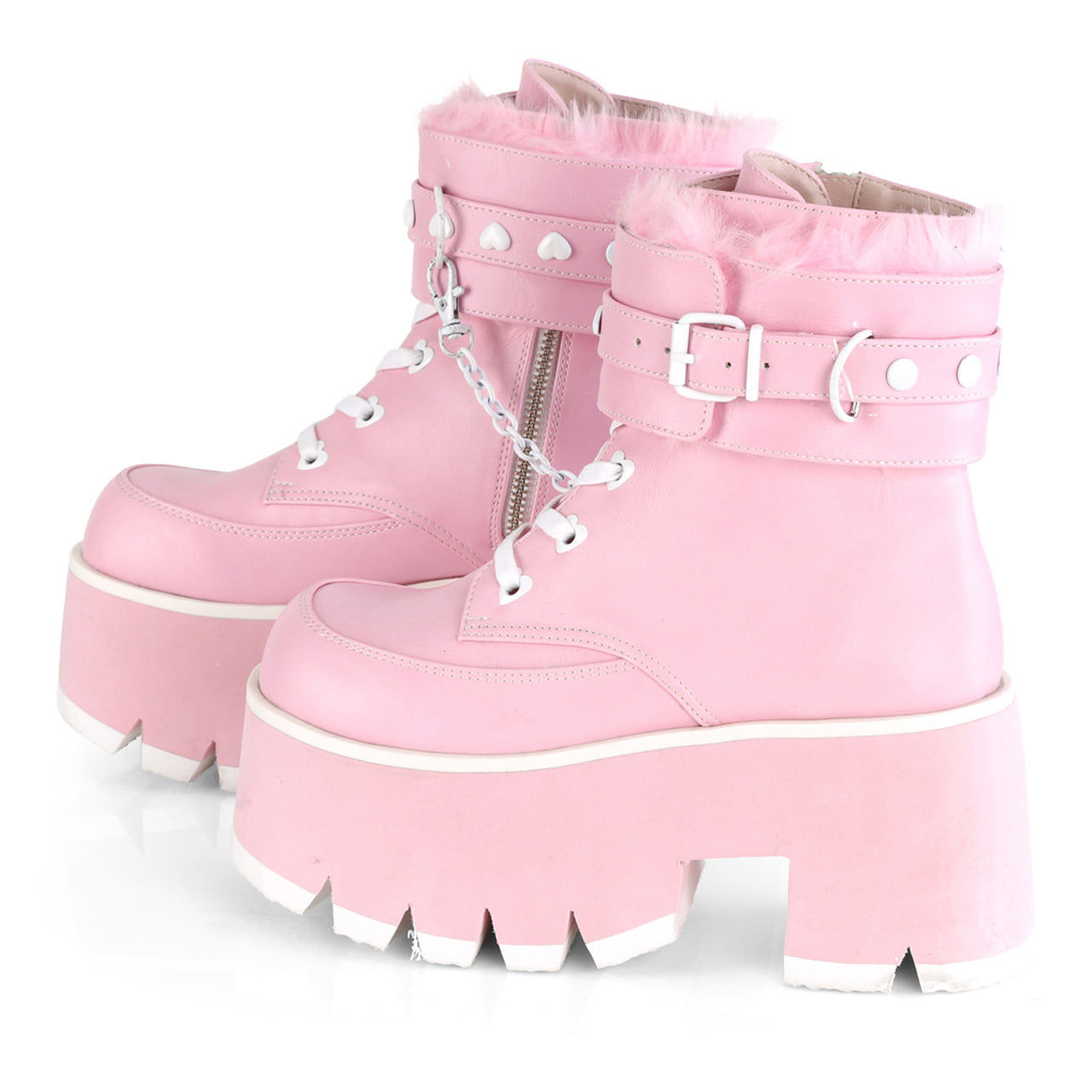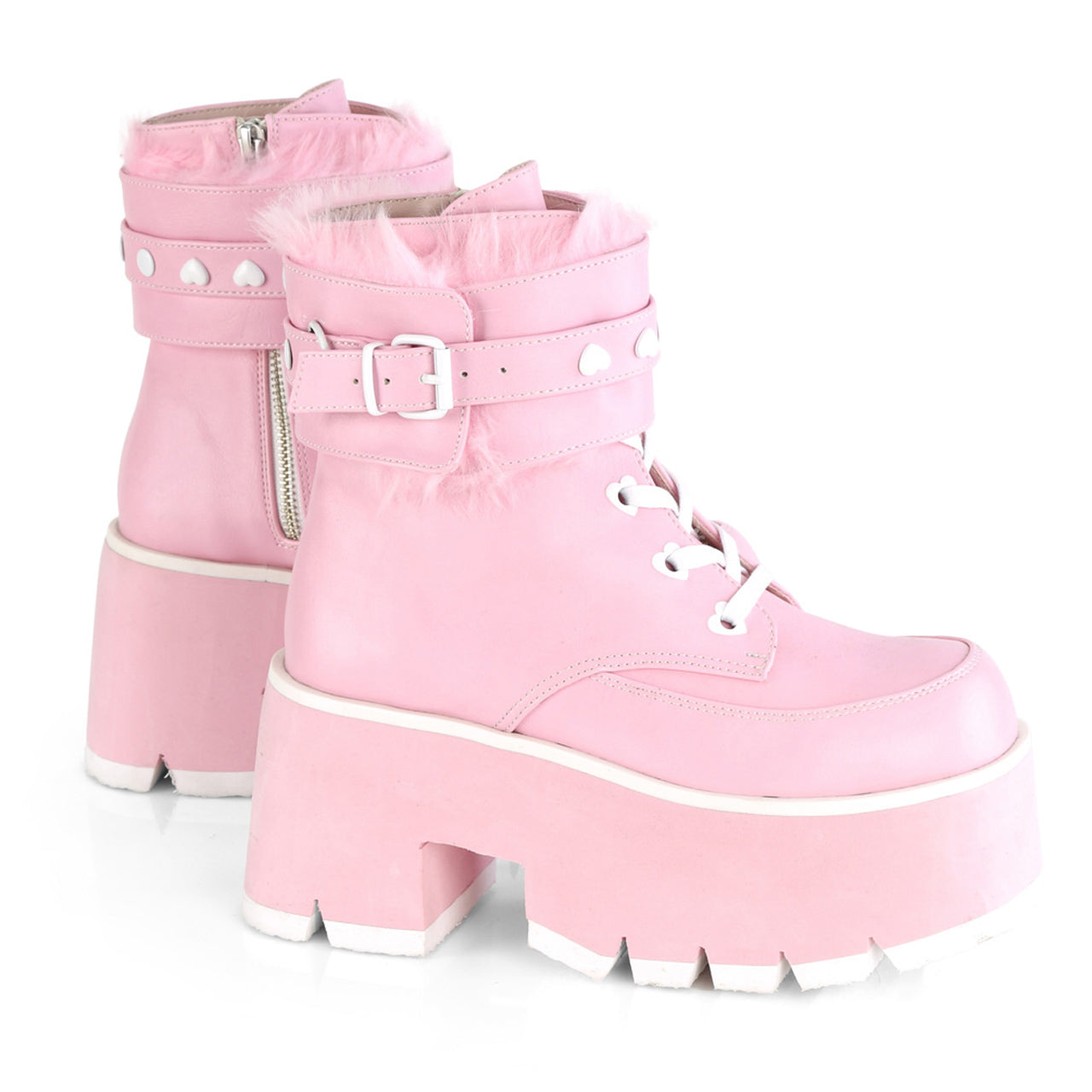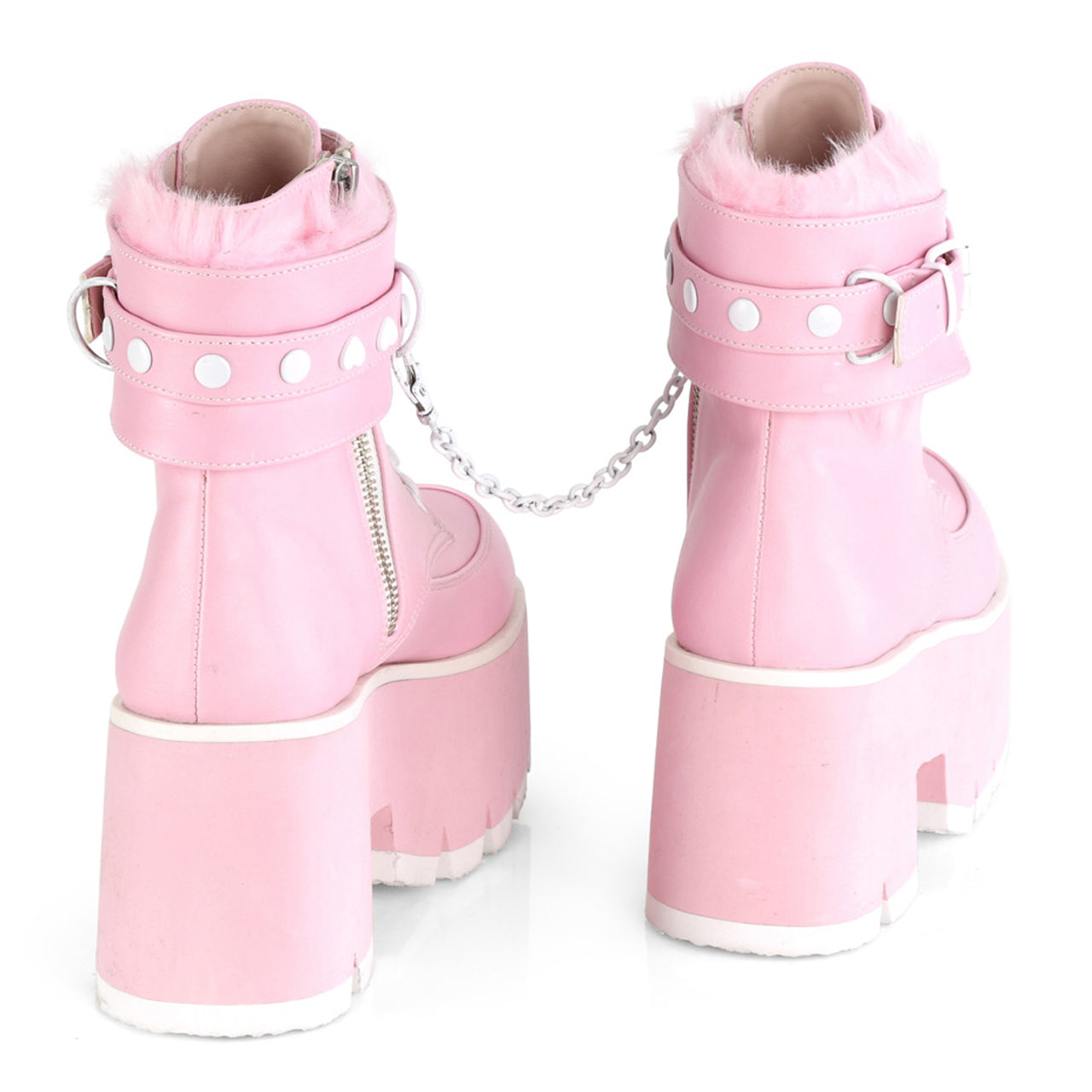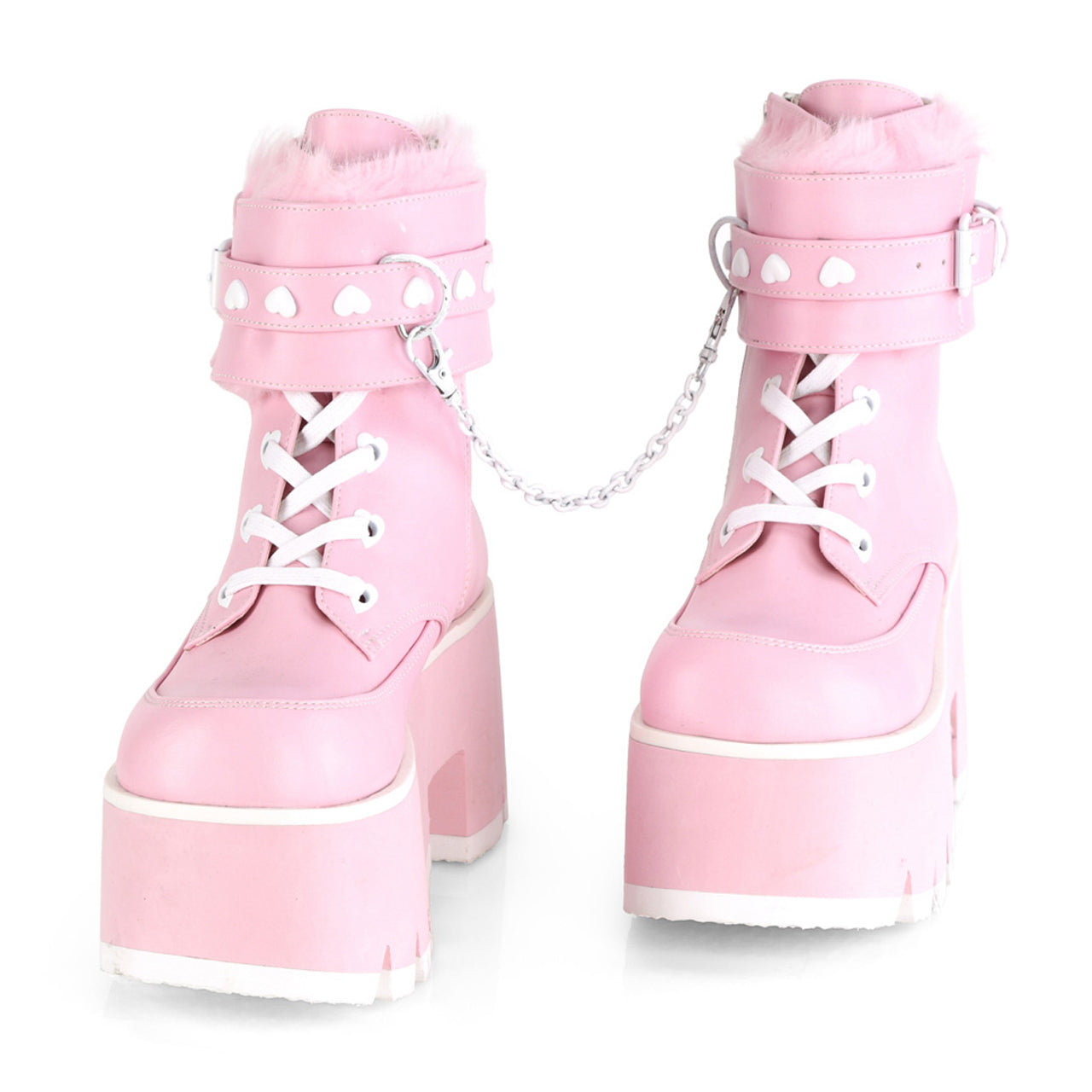 Adjustable and detachable fur ankle cuffs Heart studs, D-rings and chains with hooks Metal side zip closure Vegan leather