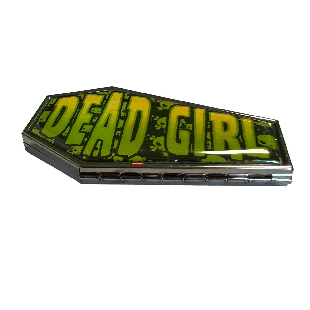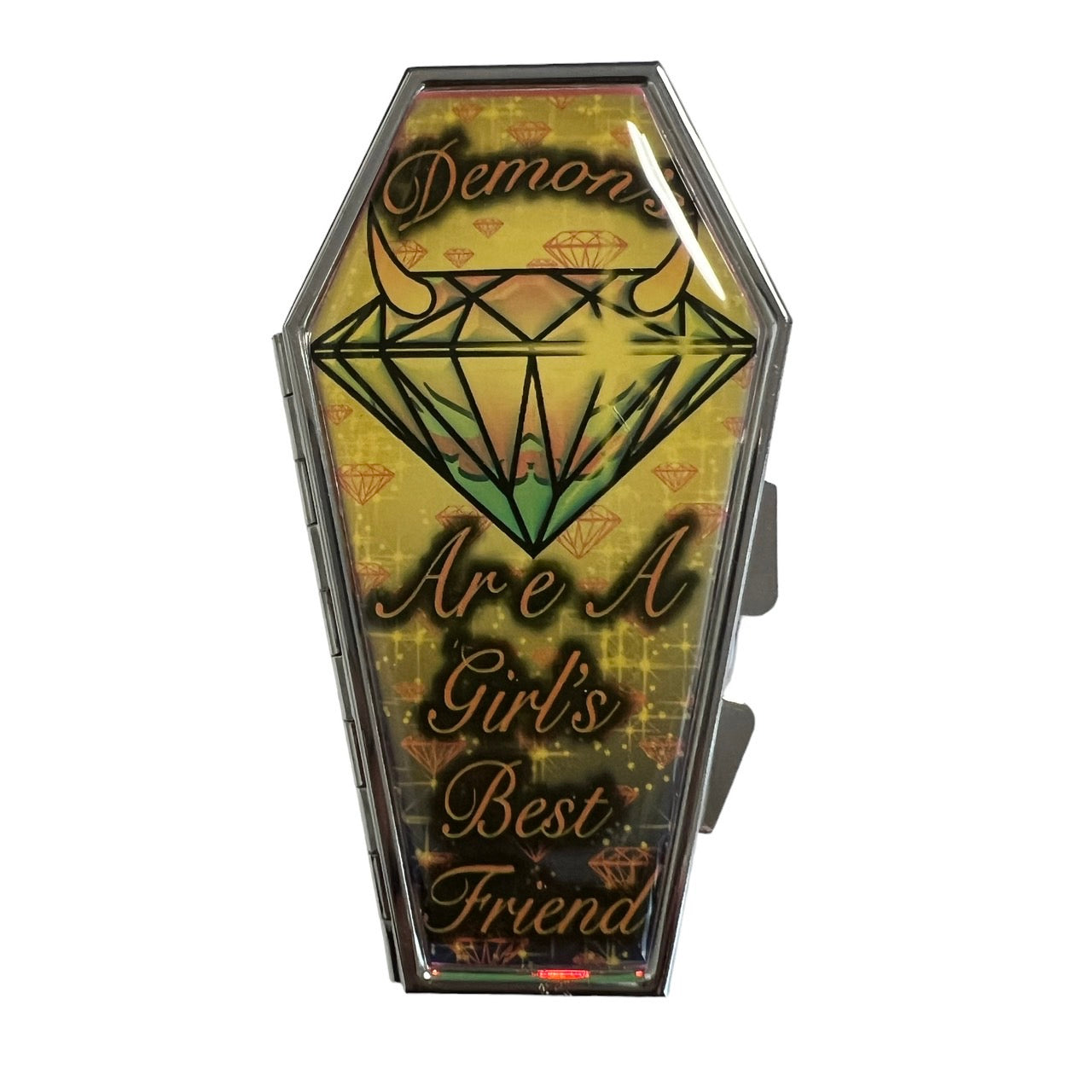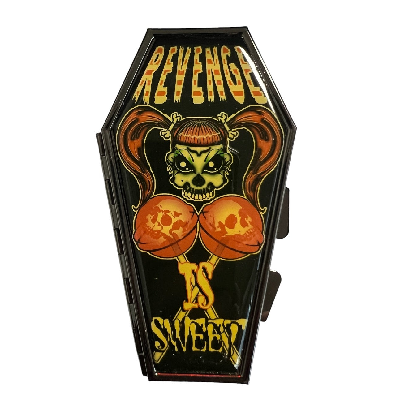 A coffin-shaped compact mirror with a cute retro-style illustration.