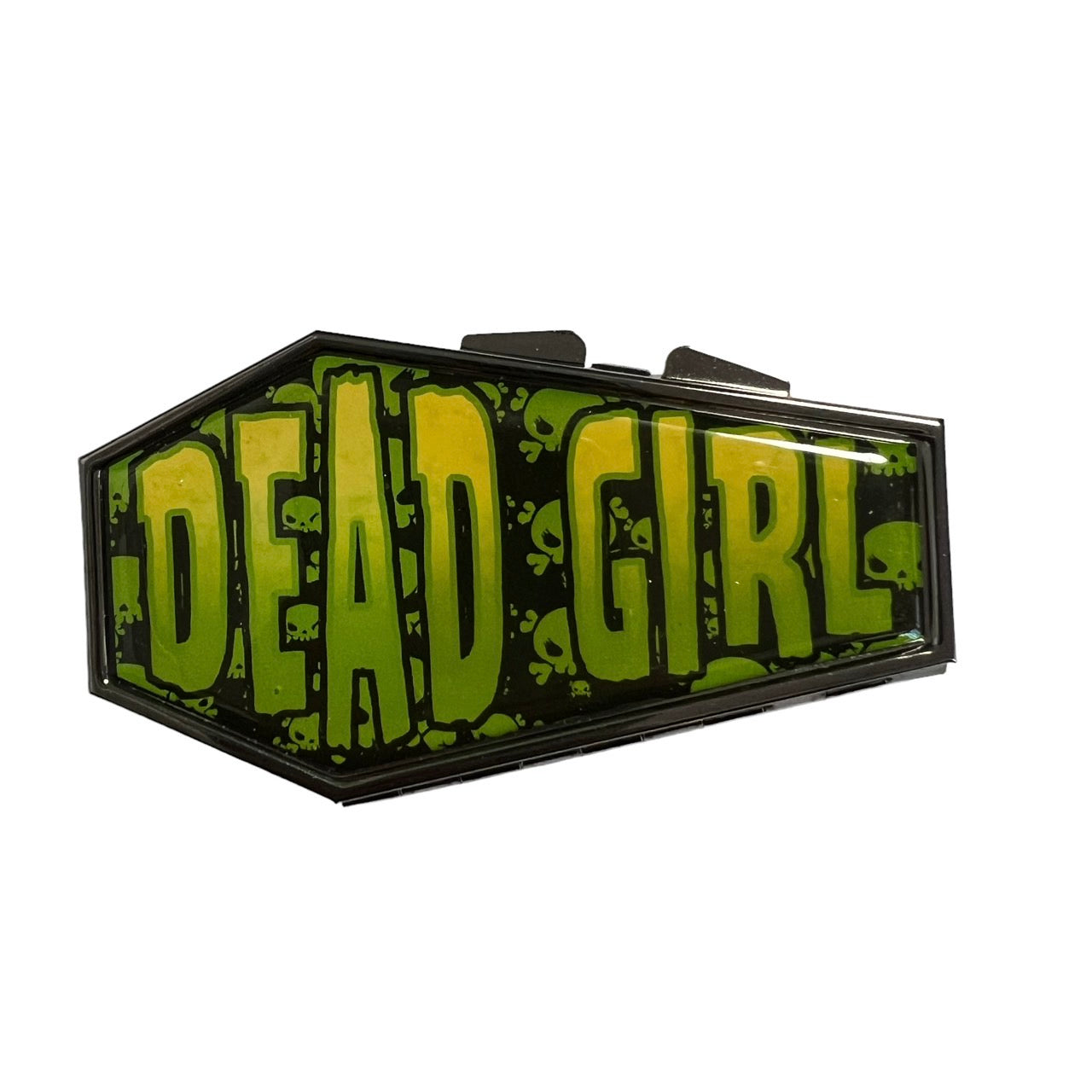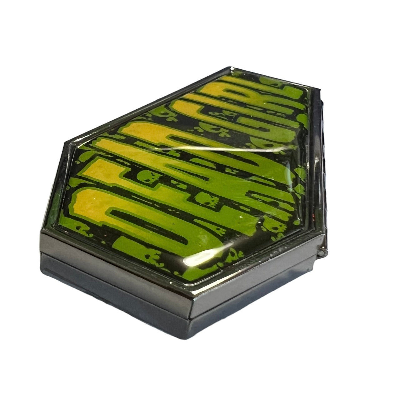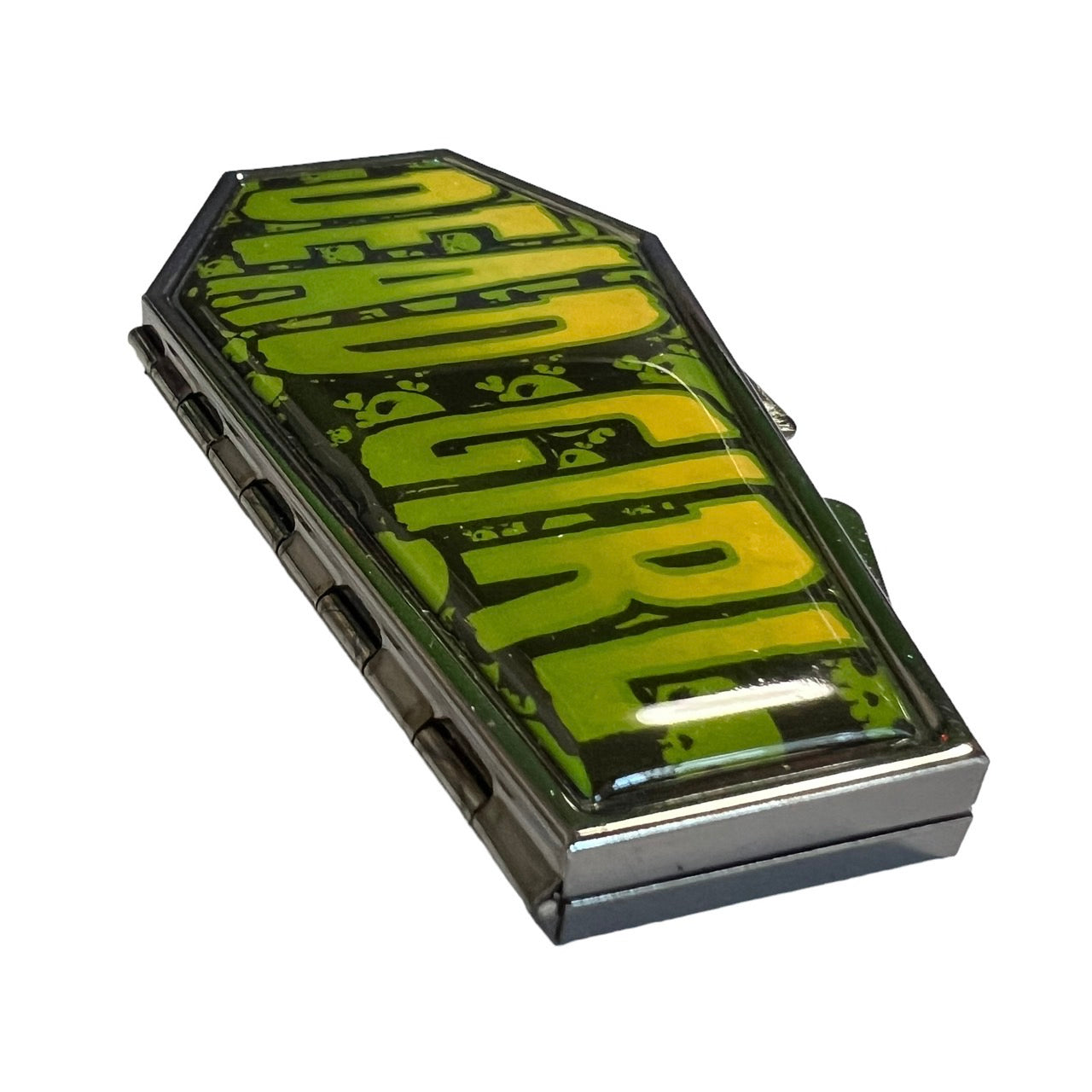 A coffin-shaped compact mirror with a cute retro-style illustration.