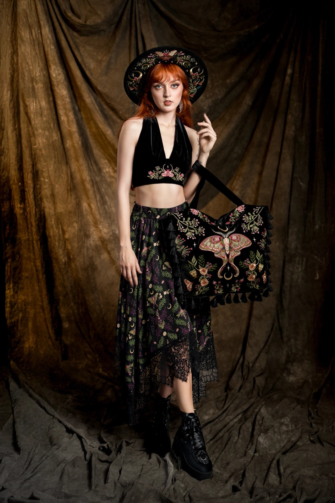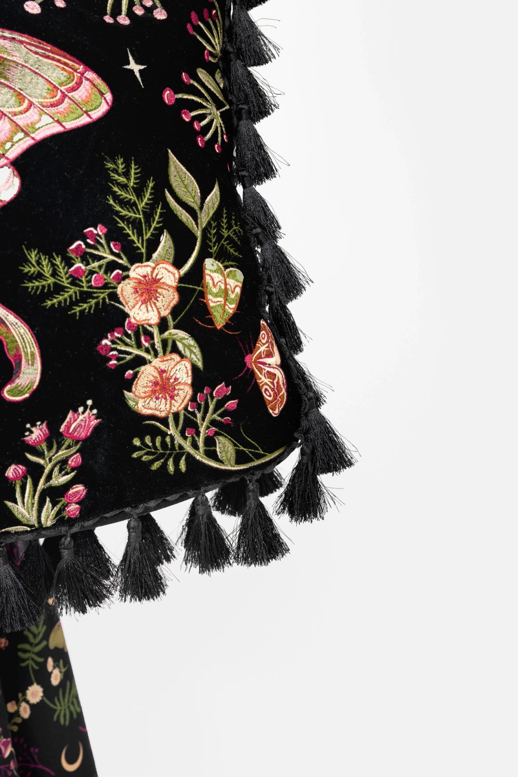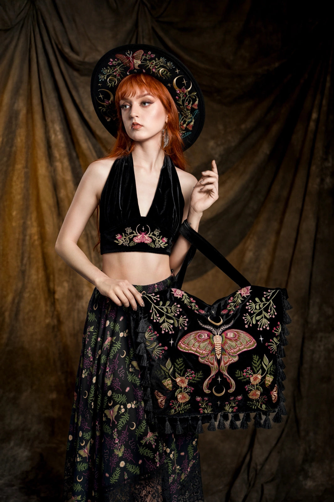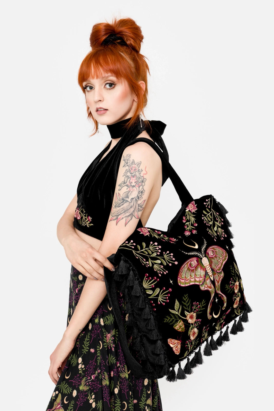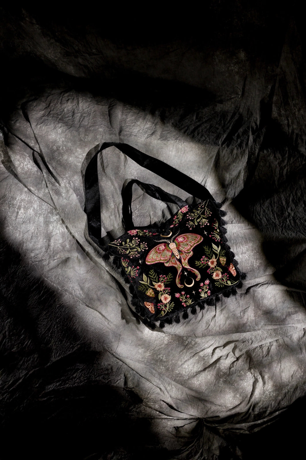 ショルダーバッグリッチなベルベット、ラグジュアリーな蛾と植物の刺繍、ふさふさのタッセルの縁取りが、まるで魔法にかけられた物語のよう。