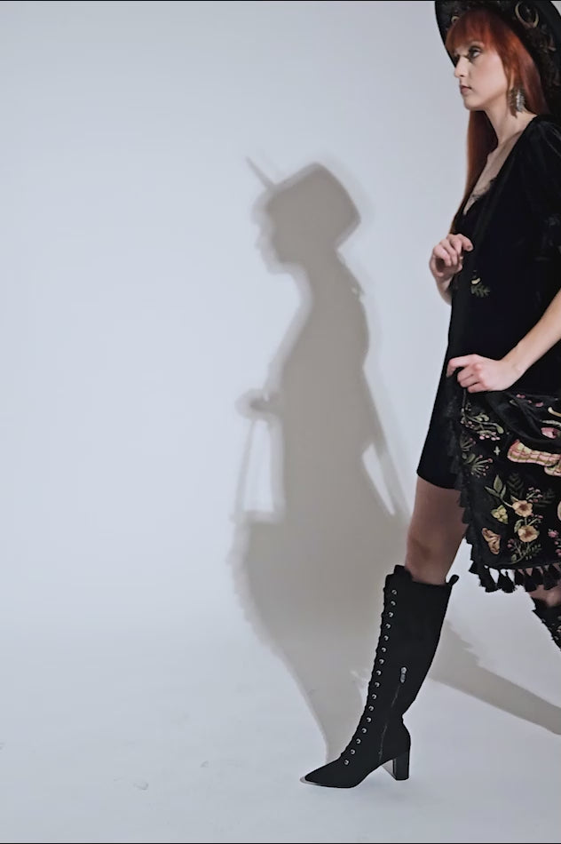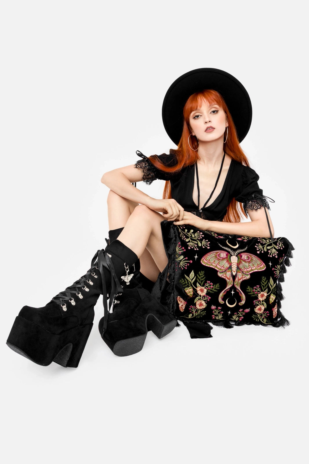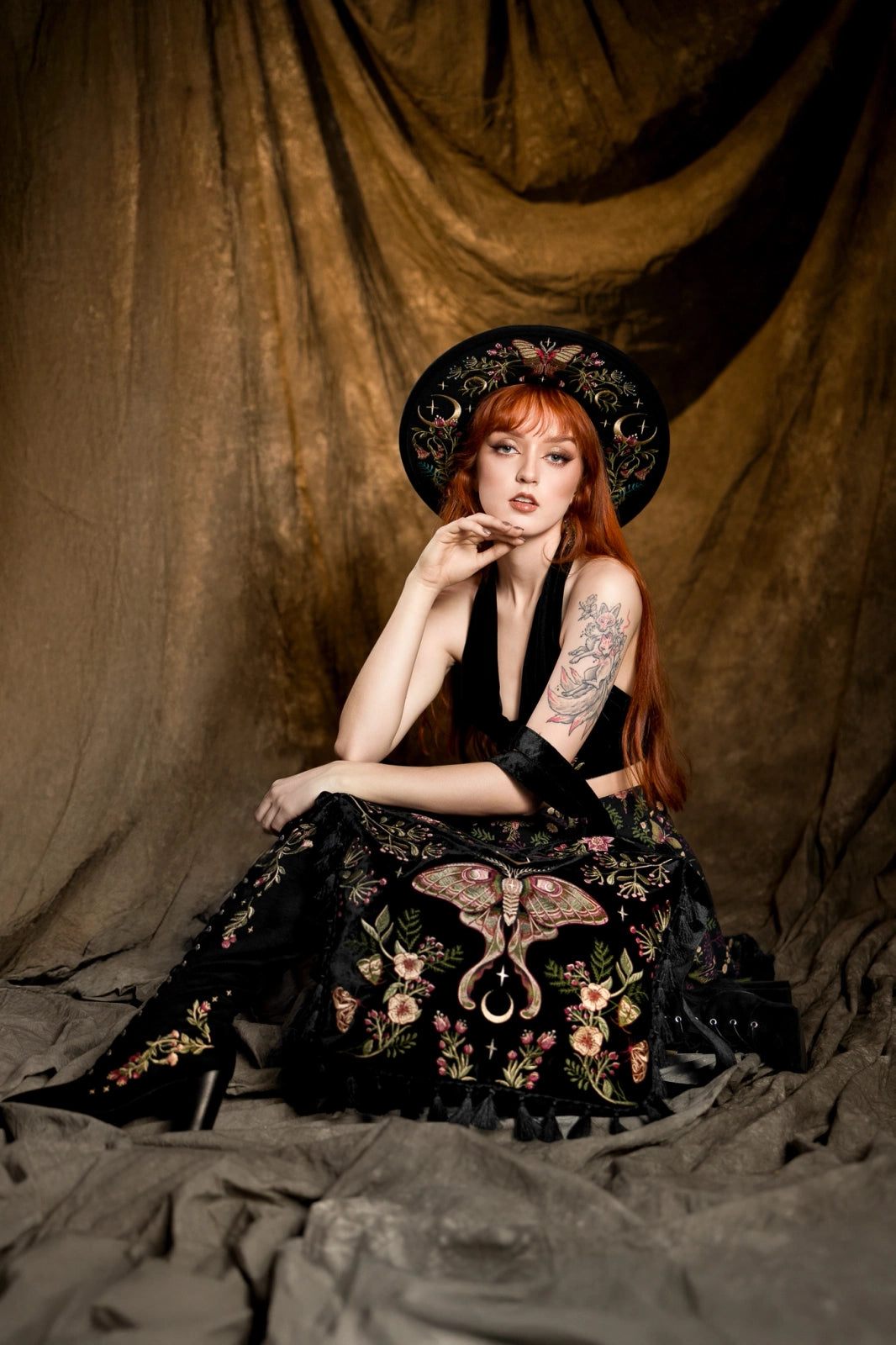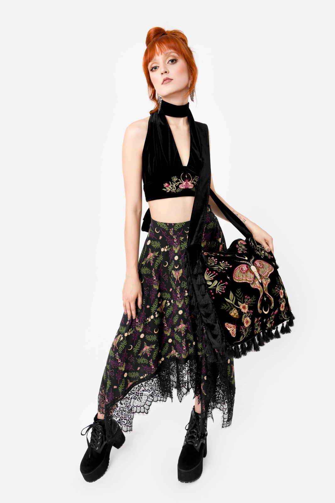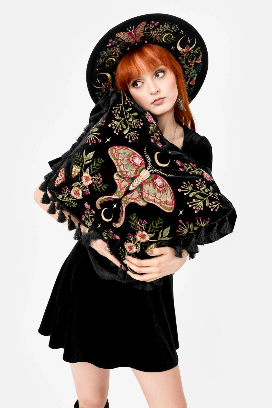 ショルダーバッグリッチなベルベット、ラグジュアリーな蛾と植物の刺繍、ふさふさのタッセルの縁取りが、まるで魔法にかけられた物語のよう。