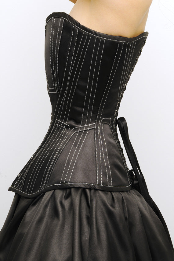 現代コルセットでは縫い代にボーンを入れるのみですが、19世紀のコルセットは縦横無尽に、自由な発想と人体の理に適ったボーンの配置で、しっかりした構造でありながも当たりが少なく、しかも優雅で美しいシルエットを保ちます。