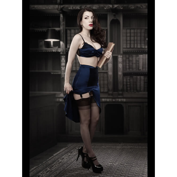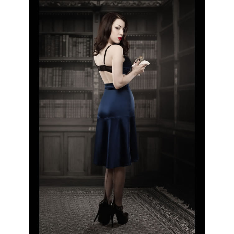 ブルーサテンにブラックレースのオーバーレイをあしらい、