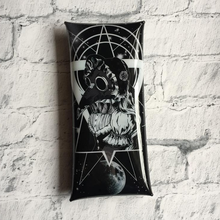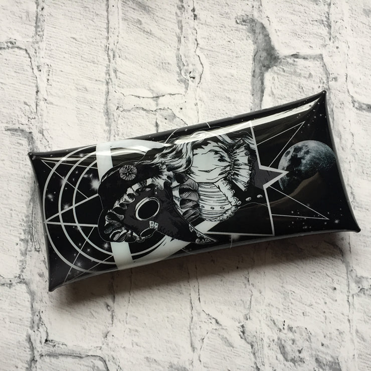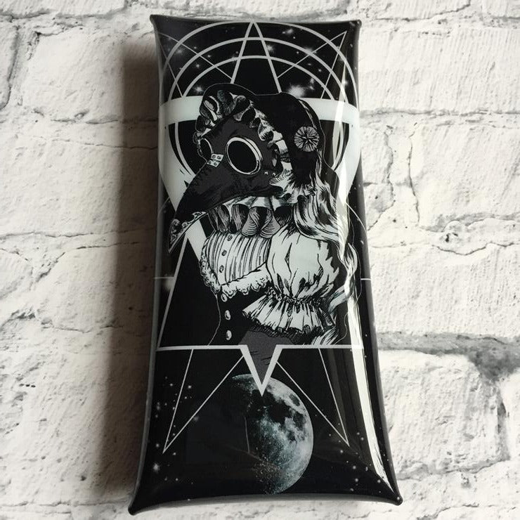 宇宙への逃避行をテーマにペストマスクを被ったヴィクトリアンな女性のイラストのゴスでダークサイバー感あるポーチ。