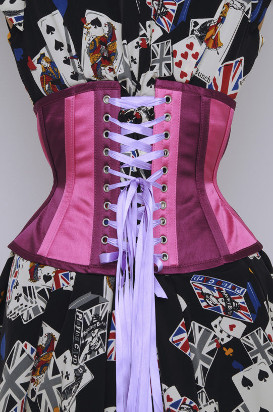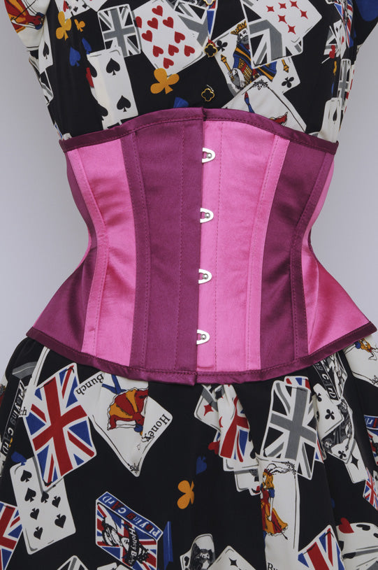 今までの砂時計型は、お腹のえぐれが特徴でしたが、今回は他社で市販されているコルセットと同様、お腹をフラットにさせる事が目的なので、初めて砂時計型を切られる方でもバスクがはめやすく、楽にくびれが出来ます。