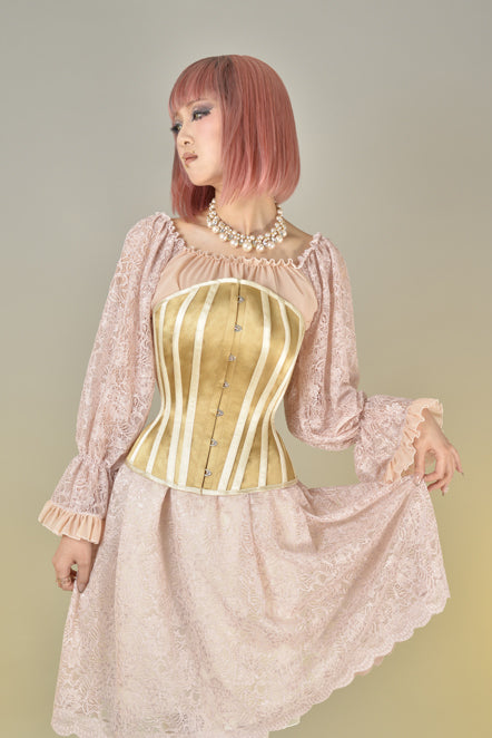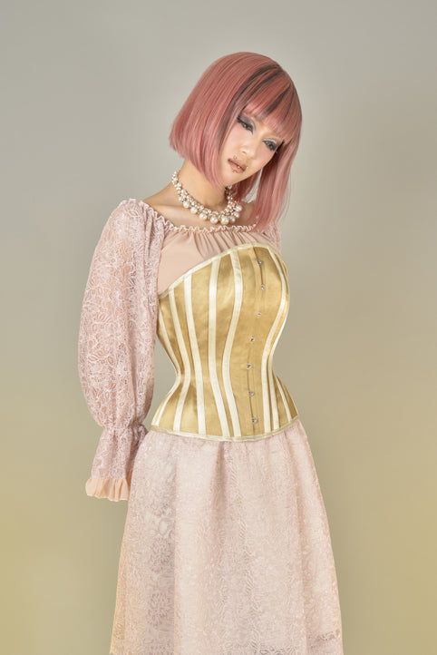後ろ身頃の切り替えが多いコルセットは、日本では珍しいので、欧米人に見られる反り背で美しい女性らしいシルエットを姿勢からサポートするようにも設計されております。