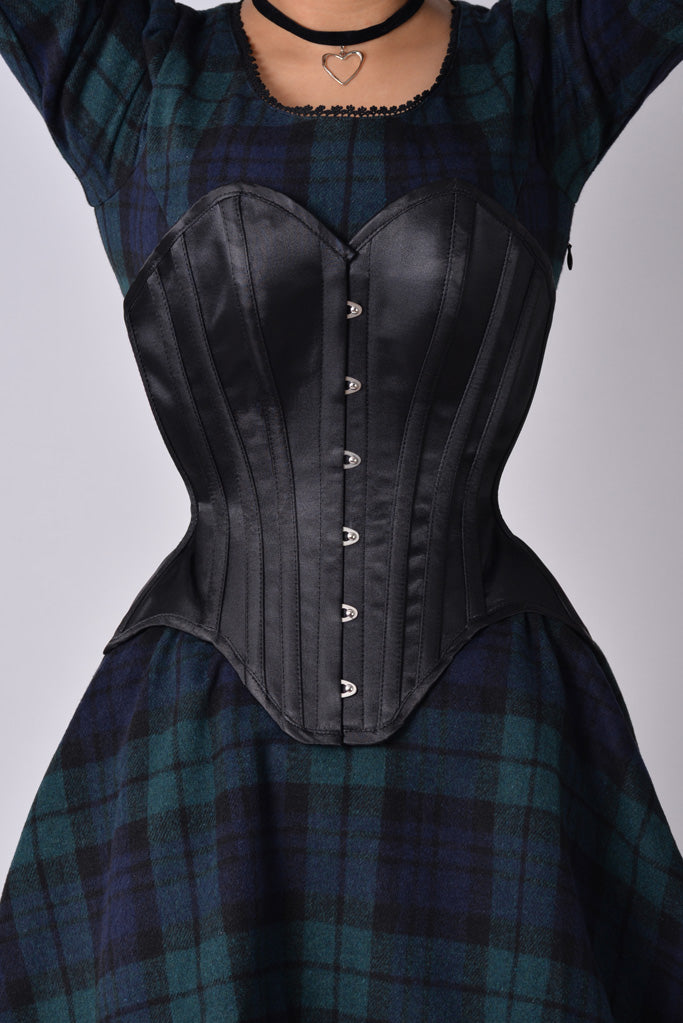 背中への負荷の圧力が、従来の砂時計型オーバーバストとSカーブオーバーバストの中間に位置するコルセットをお考え下さい。
