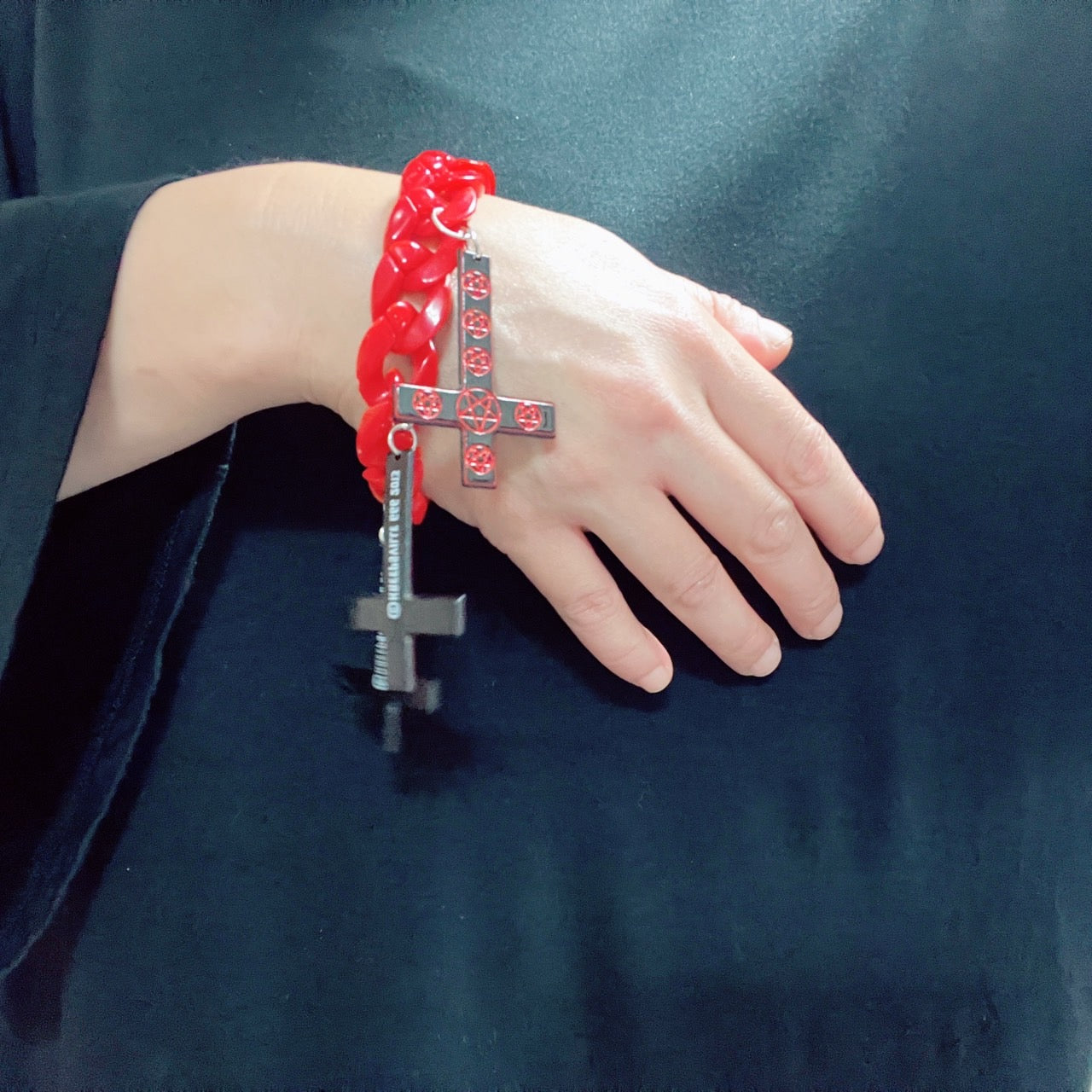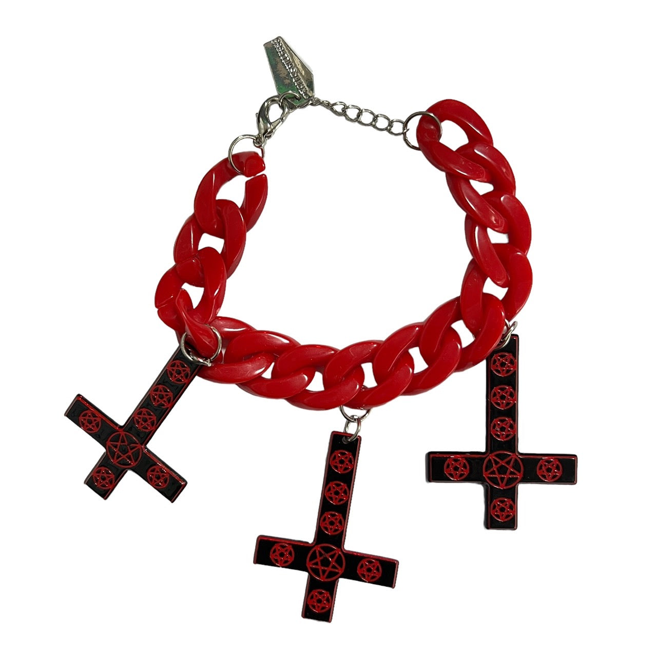 プラスチック製のワイドチェーンに逆十字がついたブレスレット。