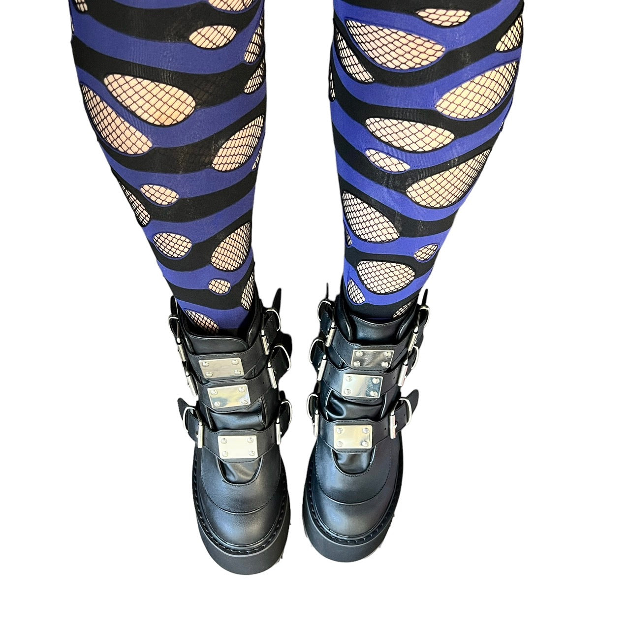 メタルプレートがついた3段バックル厚底ブーツ。
