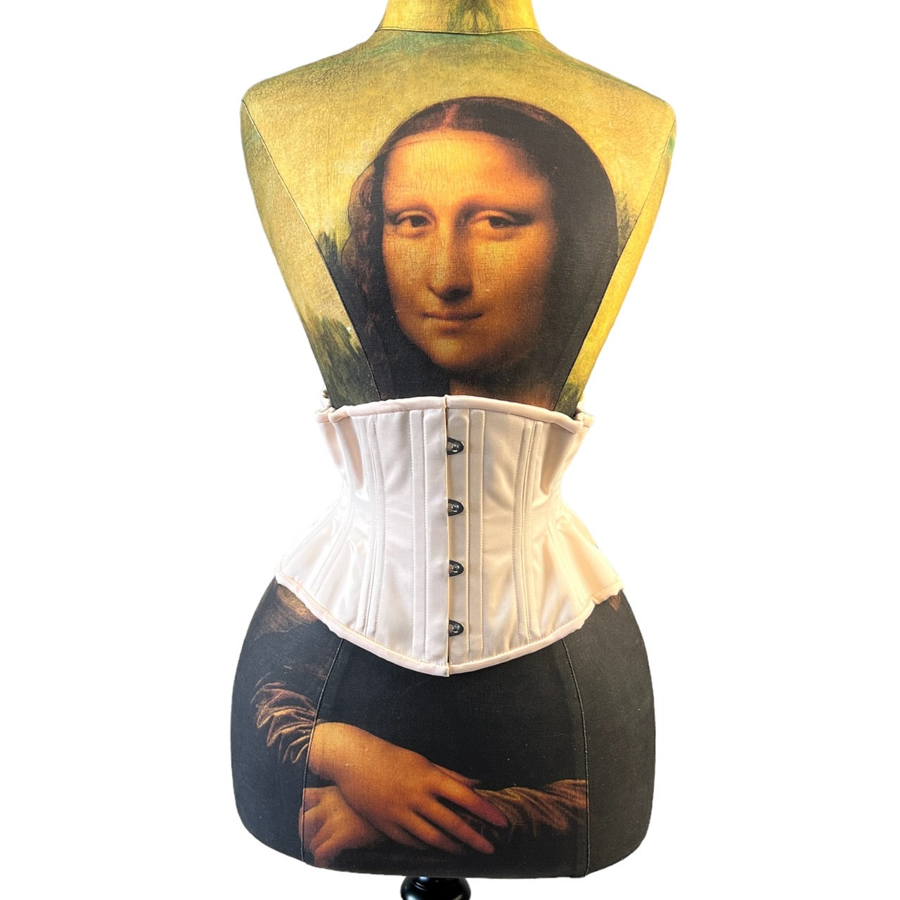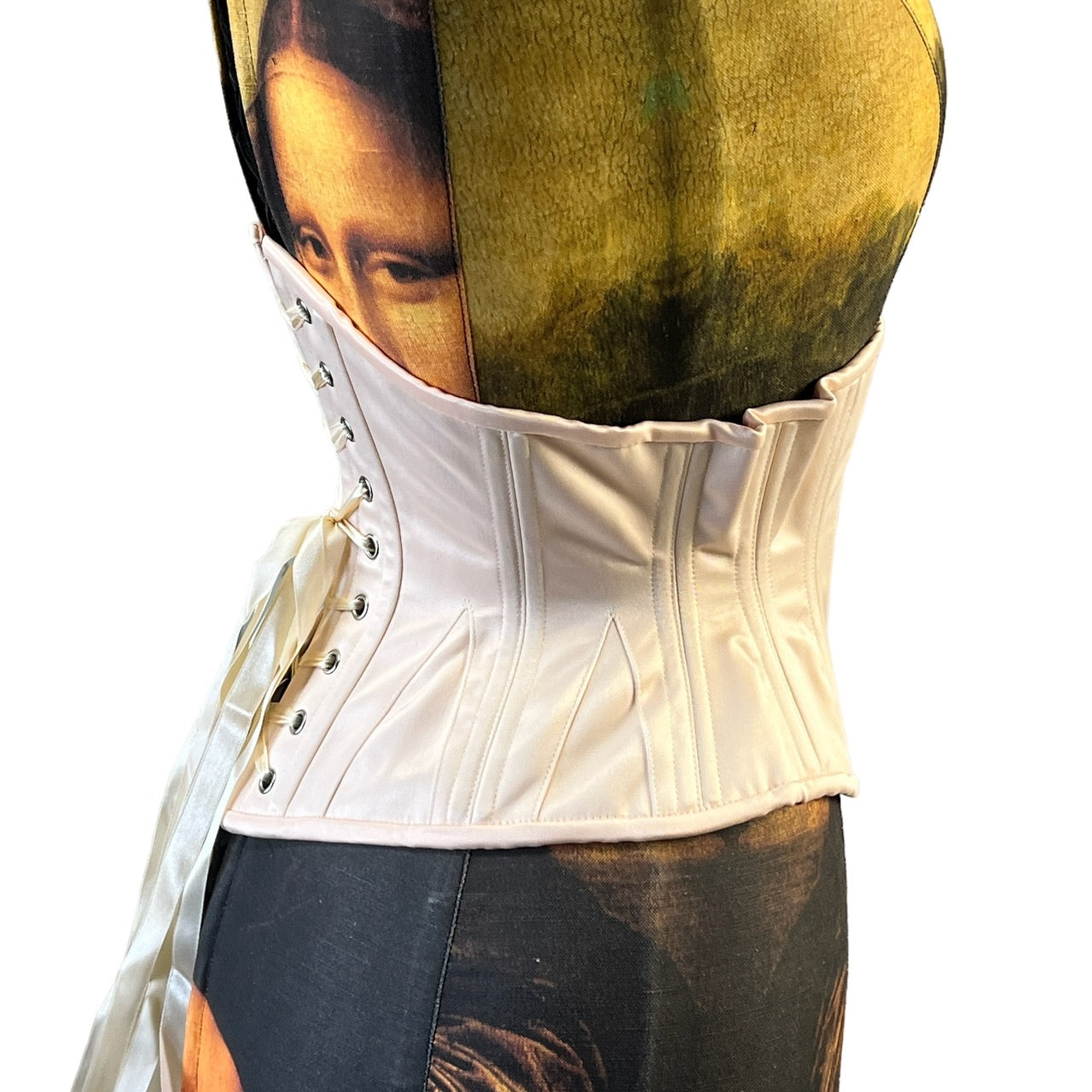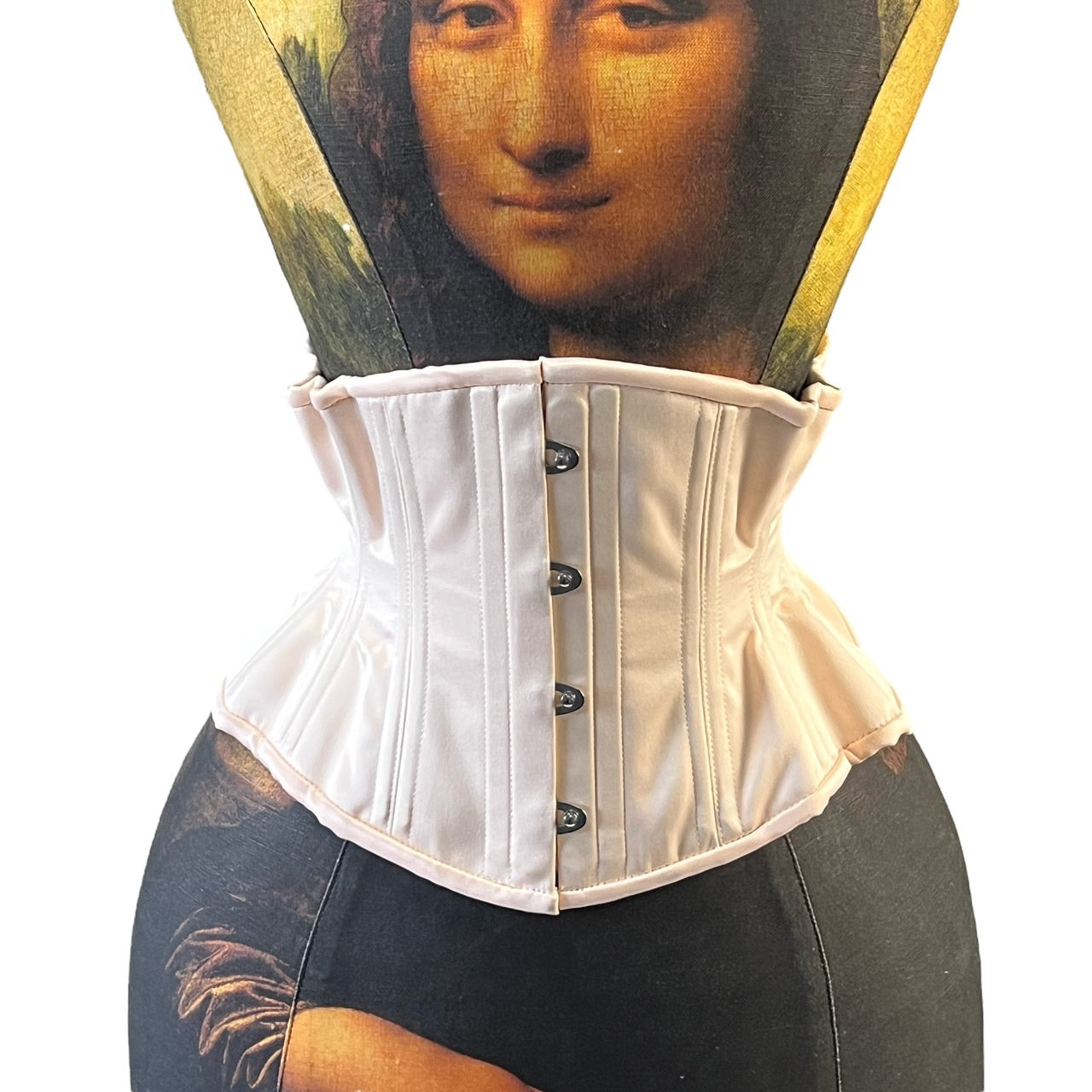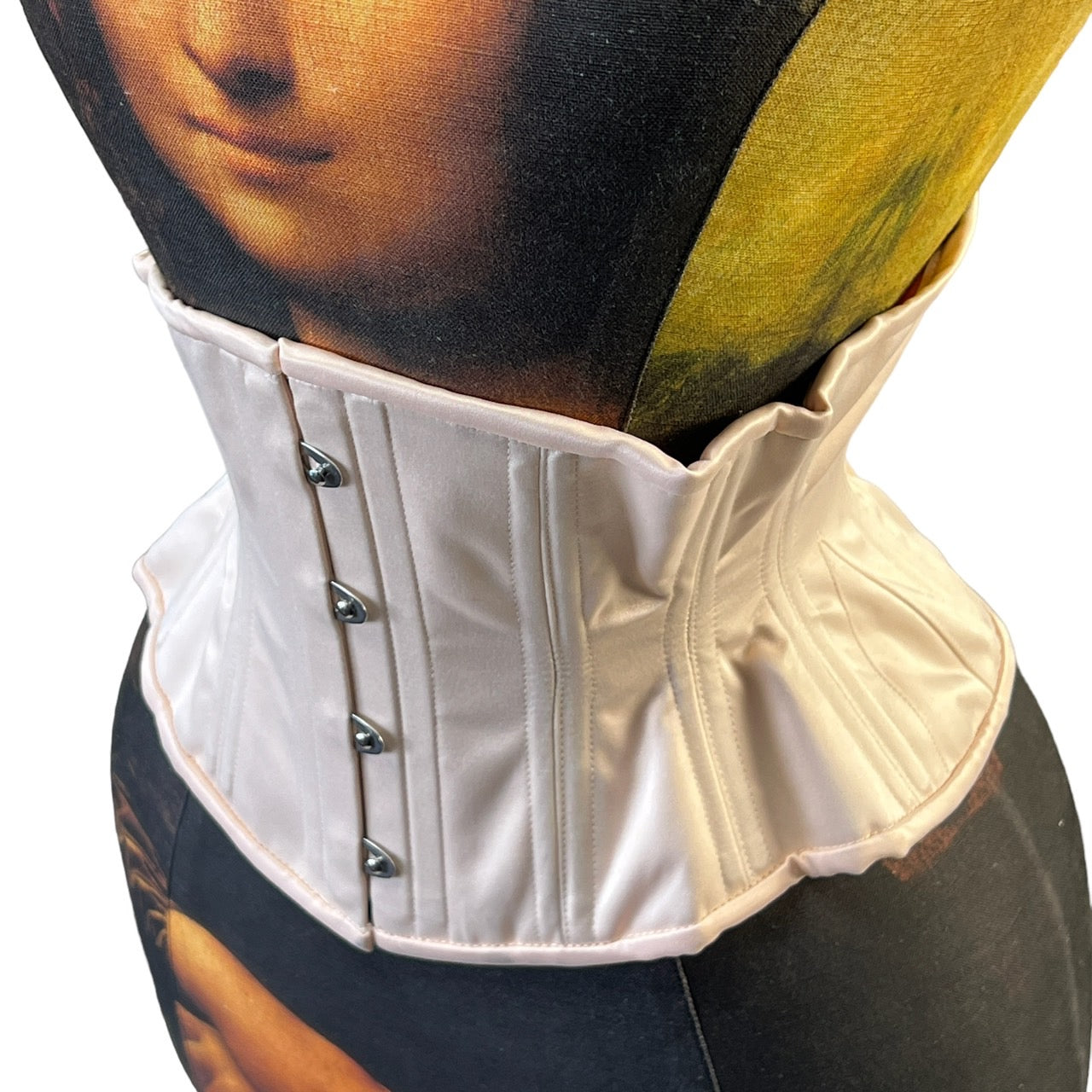 ごく短い丈の砂時計型コルセットながらドラマティックな曲線を描きます。