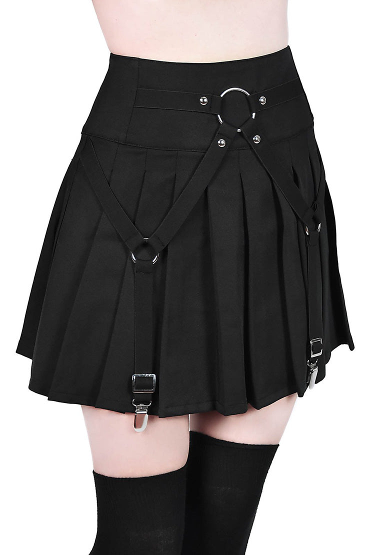 フロントに大きなOリングと、ガーターサスペンダーのようなストラップがついた、ボンデージデザインのプリーツスカート。