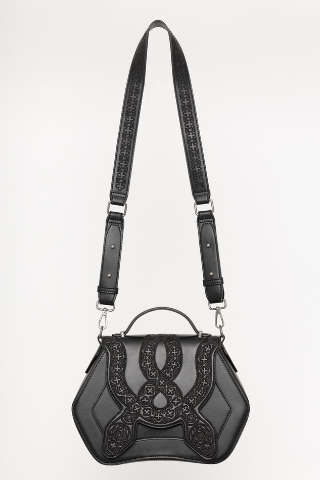 複雑な刺繍で仕立てた黒津ボディバッグ。