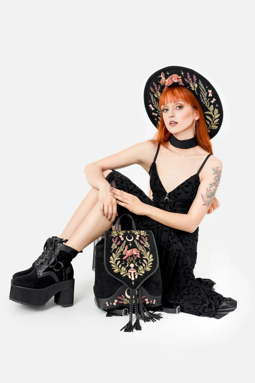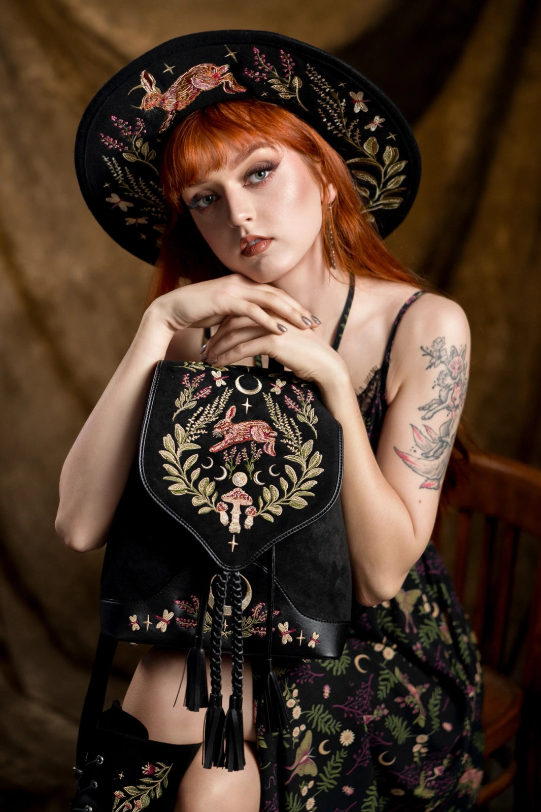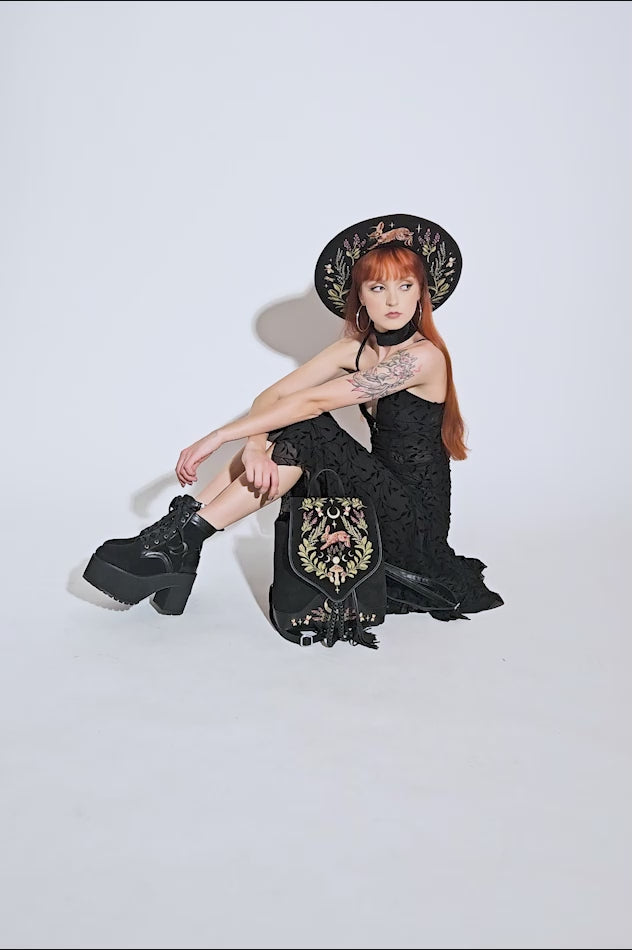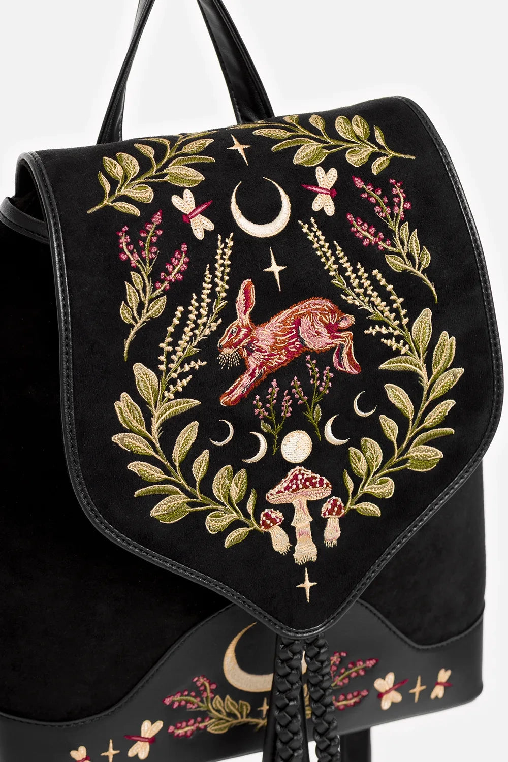 森の守護者であり、月のパートナーであるウサギを中心にキノコと森の植物を刺繍したバックパック。