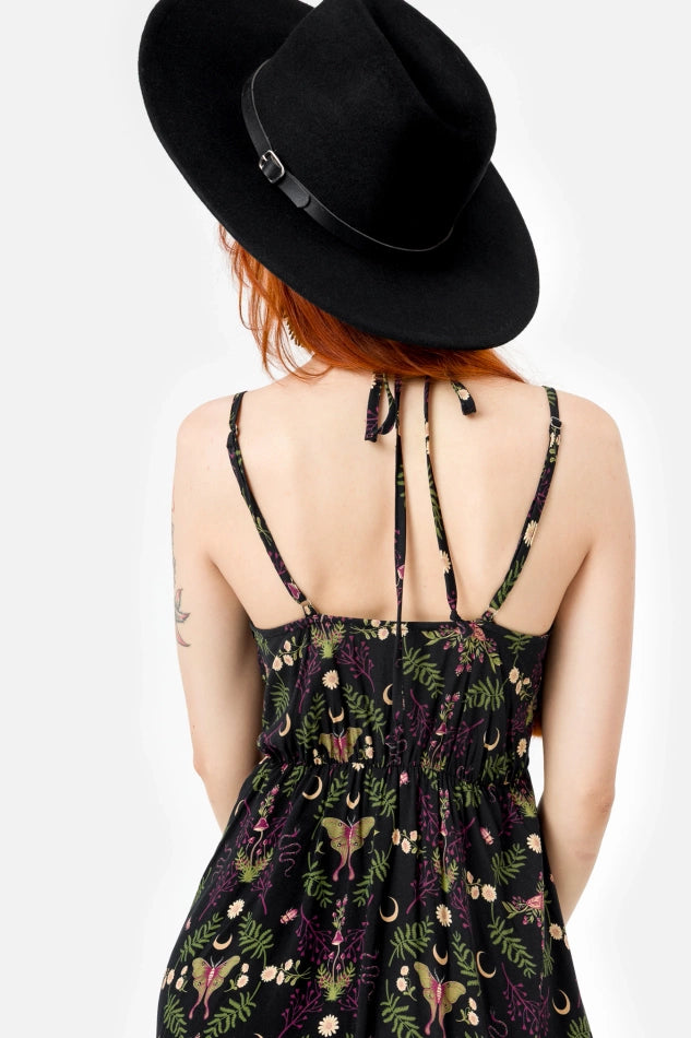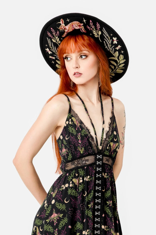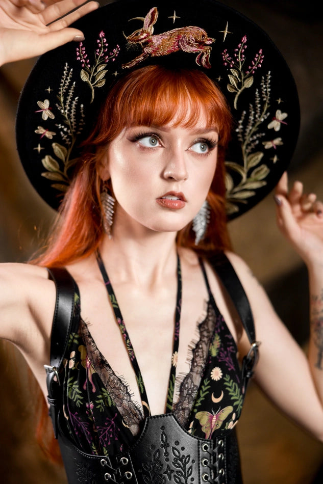 野うさぎ、トンボ、繊細な森の植物が刺繍されたブリムハット。