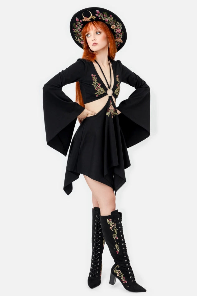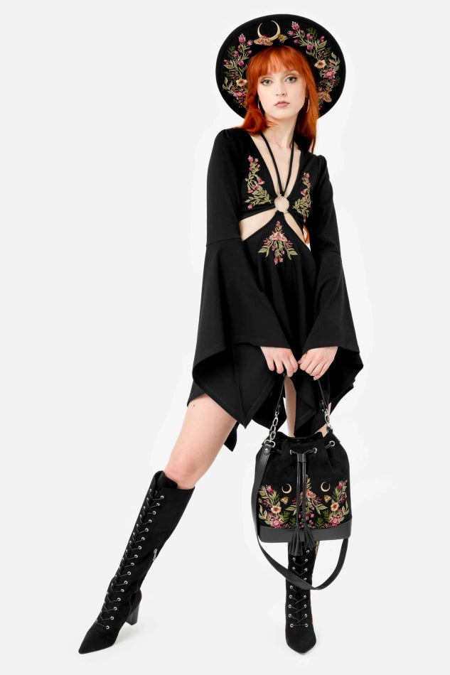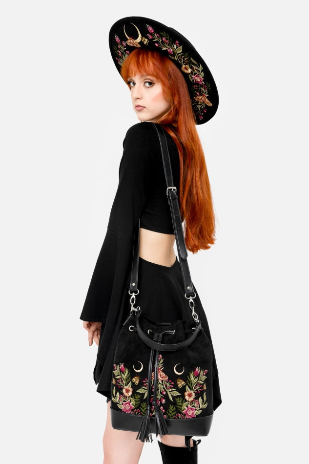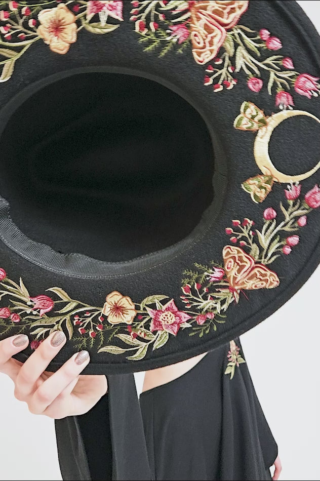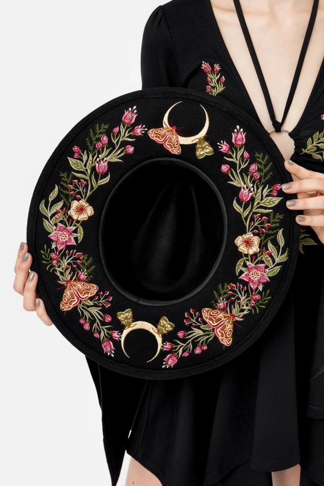 美しい暖色系の色合いで蛾、ワイルドフラワー、三日月がブリムに刺繍されています。
