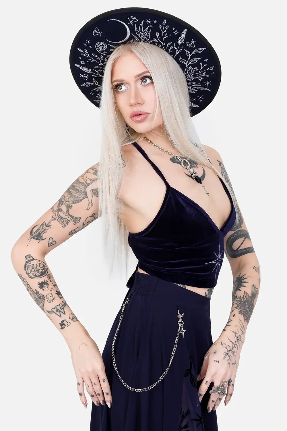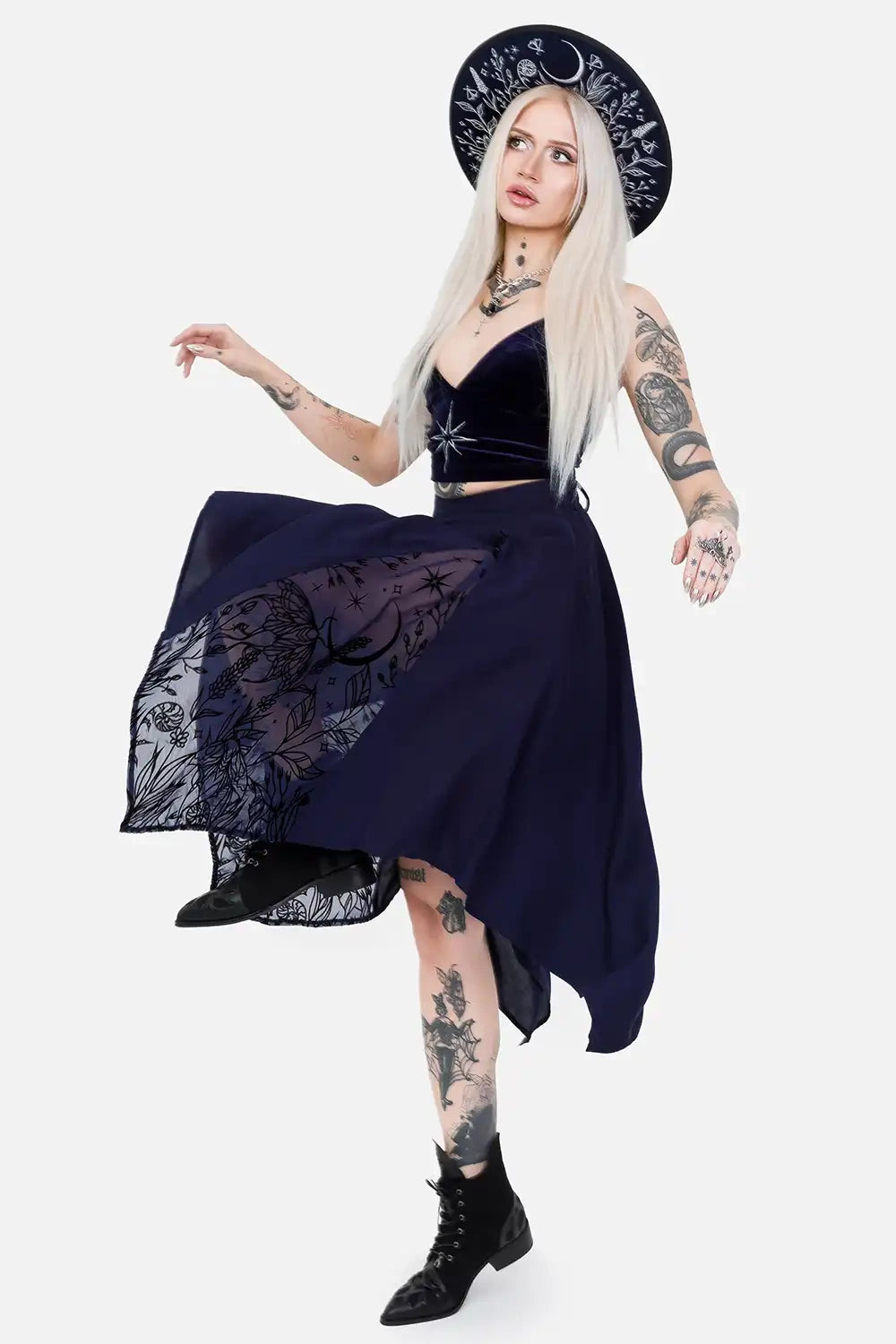 ブラックのフロッキープリントで描かれるのは、蛾や森の草花、三日月、星々――儚くも幻想的な“ウィムジゴス”とフェアリーコアの美学を纏います。