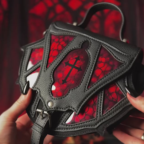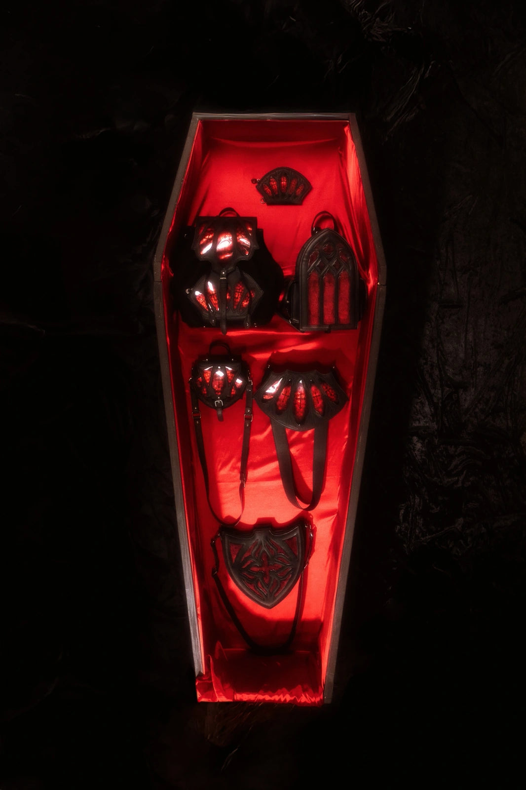 赤いステンドグラスを思わせるモチーフを配したこのゴシックバッグは、美と変容を象徴する“タリスマン”のような存在です。